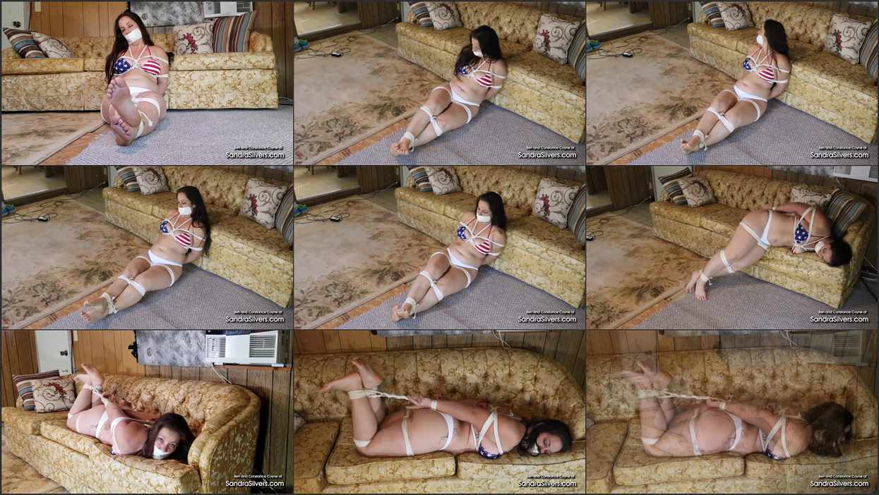 Barefoot Brunette Bikini Bound: Curvy Cutie Constance Coyne Hogtied in Stars & Stripes for Athletic Struggling!
