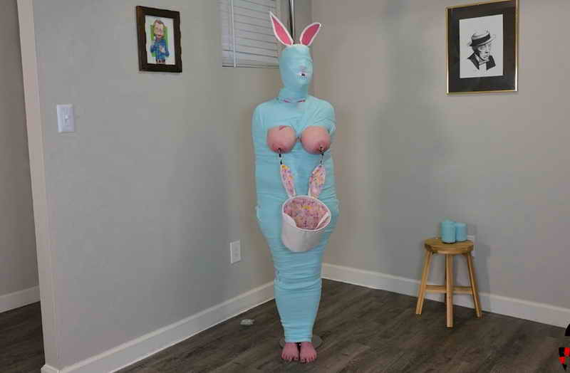 The Creepster Bunny was nude, shackled and chained to the pole in Cinched’s place. The bunny struggled but was unable to get free and Cinched had plans for the naughty bunny! He wasn’t pleased with the cruel trick the Easter Bunny had played on him so he decided to teach the bunny a lesson! He wrapped the bunny to the pole with bandage wrap and started groping and sucking on the exposed nipples. He delivered some swats to the bunny’s bare butt-cheeks before wrapping from the ankles up to the bits. He stuck his hand down to the bunny’s bits and found the piercing nestled between the lady lips. He got the bunny all riled up and was cruel enough to deny a release. Cinched said he was going to edge the bunny all year and maybe he’d let the bunny orgasm next year… MAYBE! He wrapped the helpless bunny’s body from the ankles up, leaving the tits free for more torment and then he wrapped the bunny’s head to the pole. Cinched wasn’t done yet though, he had one more plan to complete. He put clamps on the exposed nipples and hung the easter basket from them. The bunny whimpered and whined as he left the bunny to her torment.