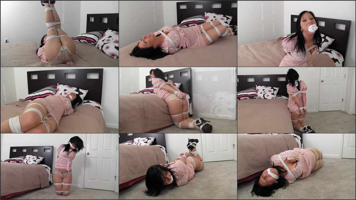 Crystal wants to be tied up, and she wants it to be tight. When she sees they have a pair of his panties, she asks them if they are going to gag her with them, “Are you going to shut me up?” she asks in anticipation. Soon, she is struggling, bound and gagged. She is getting very turned on. Then they crotch rope her. This gets her very worked up, and she makes herself have an orgasm. But soon she is going to want something other than a piece of rope up her pussy.