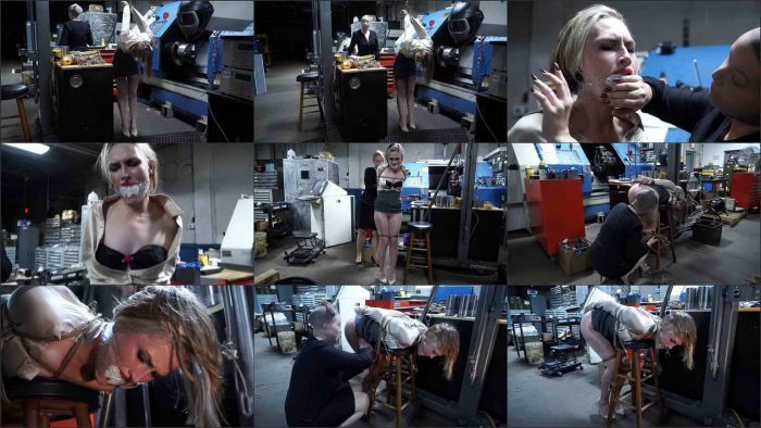 Amanda is in a basic strappado for a bit when a woman in a stocking cap approaches and cranks her up higher until she squeals. She leaves her there again. When she comes back she lets her down and gags her with some lace panties and clear tape. Then she is tied bent over a stool. her pencil skirt is pulled up. The poor dear has no idea what will happen to her, so vulnerable in that position…