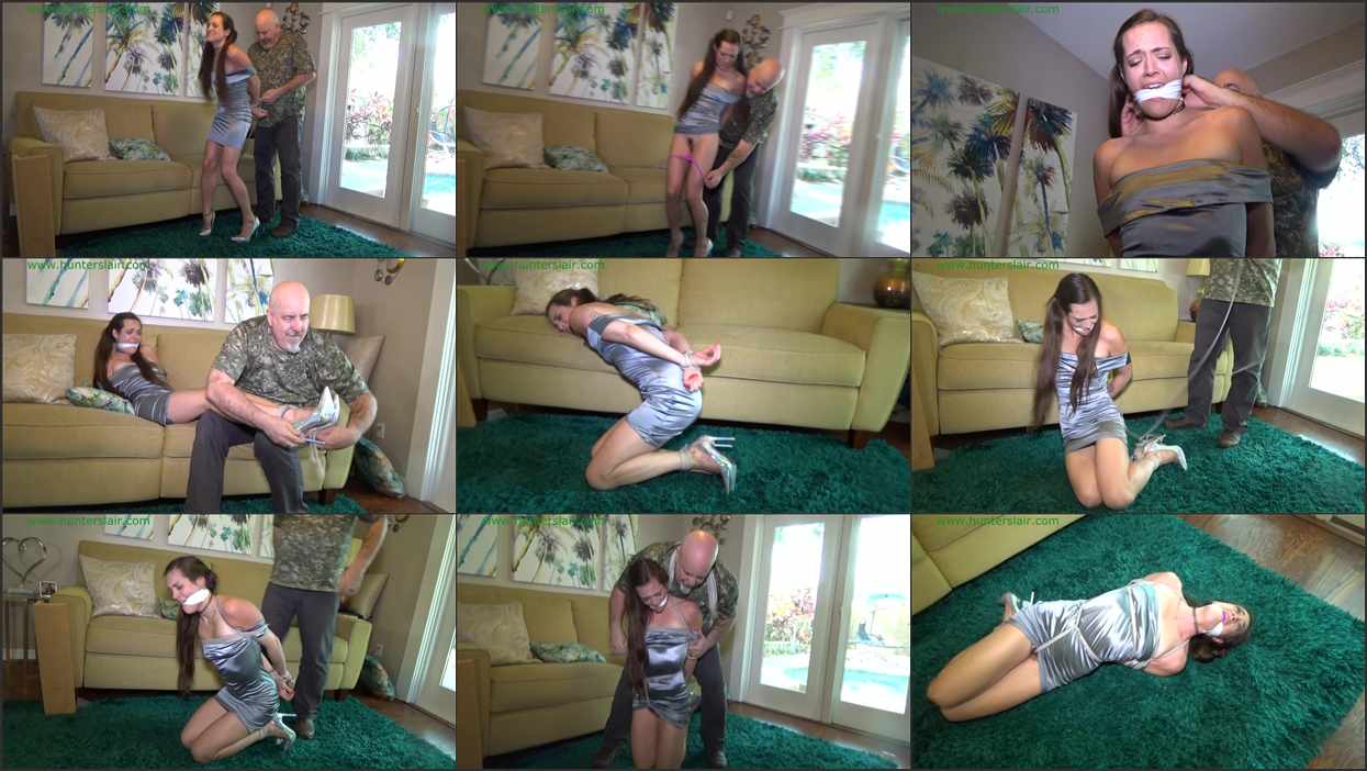 Fresh out of rehab pretty party girl heiress Dacey was ready to party, but her daddy has left her with a body guard/babysitter, Hunter, to keep her from going out. But Dacey was super bored and missed her friends, she needs to get out before she goes crazy. With her daddy out of town Dacey thinks she can give Hunter the slip, so she gets get dressed to go to the club in her skin tight satin dress and stiletto heels and sneaks through the house not knowing where Hunter is. There is no sign of him in the house so she thinks she can slip out the back door unnoticed and climb in an Uber for her much needed night out to party. But she doesn’t get far as she slips out the back door she is grabbed from behind by a pair of strong hands. Hunter drags pretty Dacey back in the house and demands to know what she is up to. Defiant Dacey thinks she can bully and bluff her way out. She demands her let her go and threatens to fire him if he doesn’t let her out. But Hunter isn’t worried about her threats, he is under strict orders to insure that defiant Dacey doesn’t get out using any means necessary. Dacey struggles and stomps her feet demanding to be let go. Hunter knows that Dacey will try again so he pulls her wrists behind her back and ties her wrists together with rope. Dacey can’t believe what is happening and continues to demand he stop and begins to curse, swear and bully. Hunter tells her to keep quiet or he will gag her, Dacey refuses to keep quiet so he decides to humiliate her and orders her to remove her panties. Dacey looks up and sees he means business so she begins to remove her panties. But with her hands tied behind her back she is having trouble so the Hunter helps her. Her panties slip down her legs once they cross her knees and they fall around her ankles…