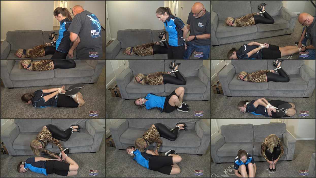 Rachel is delivering a package when she notices that the door is open a bit when she sees housewife Dakkota all tied up. As she tries to free her she is grabbed and tied up by a burglar.