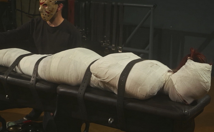 The clip begins with Daria already wrapped from neck to toes in layers of white adhesive medical bandages. Her head is still free, and she is wearing heels over sheer nylon pantyhose. I gently lay her down and remove her shoes, then begin wrapping her feet to complete the cocoon. Her head is bandaged next – Daria’s muffled expressions throughout this process are priceless and dramatic, almost cinematic.
