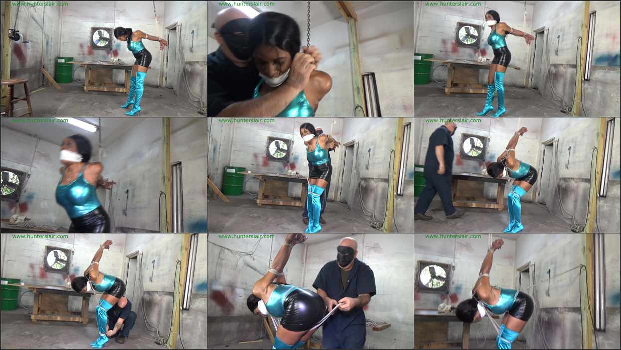 Strong black Domme Dawn Isabella struggles in the lair with her arms welded tightly together behind her back with ropes. The ropes slice deep into the soft flesh around her upper arms, crushing her elbows together and her wrists are bound and tethered to a chain hanging down from an overhead pulley. Dawn twists and turns, pulling desperately at the ropes, she isn’t used to being on this side of the ropes and she such doesn’t like it. She sees the winch on the other side of the room and kicks at it with her stiletto boots, but it is just out of reach. Then she hears the Hunter comes in and demands that she has had enough of this foohishness and orders him to untie her now. But the Hunter tells her that her new experience has just started as he pulls an old rag out of his pocket. Dawn tries to struggle away but her grabs her and XXXX her big out open and stuffs the rag deep in her mouth. He pulls out a roll of shiny white tape and quickly seals her mouth shut with the rag packed deep inside. He goes over to the winch and begins to crank it. Dawn can feel her hands being raised up high behind her back as he cranks the winch. Then the Hunter pulls down on the chain jerking her hands up high in the air, twisting her poor shoulders in a severe strappado as he checks her flexibility. He releases the chain allowing Dawn to lower her arms from the severe strappado as he sorts through more rope. The Hunter then ties her knees tightly together then cinches them together with another long rope. This rope is run up over her shoulders and between her crushed elbows.