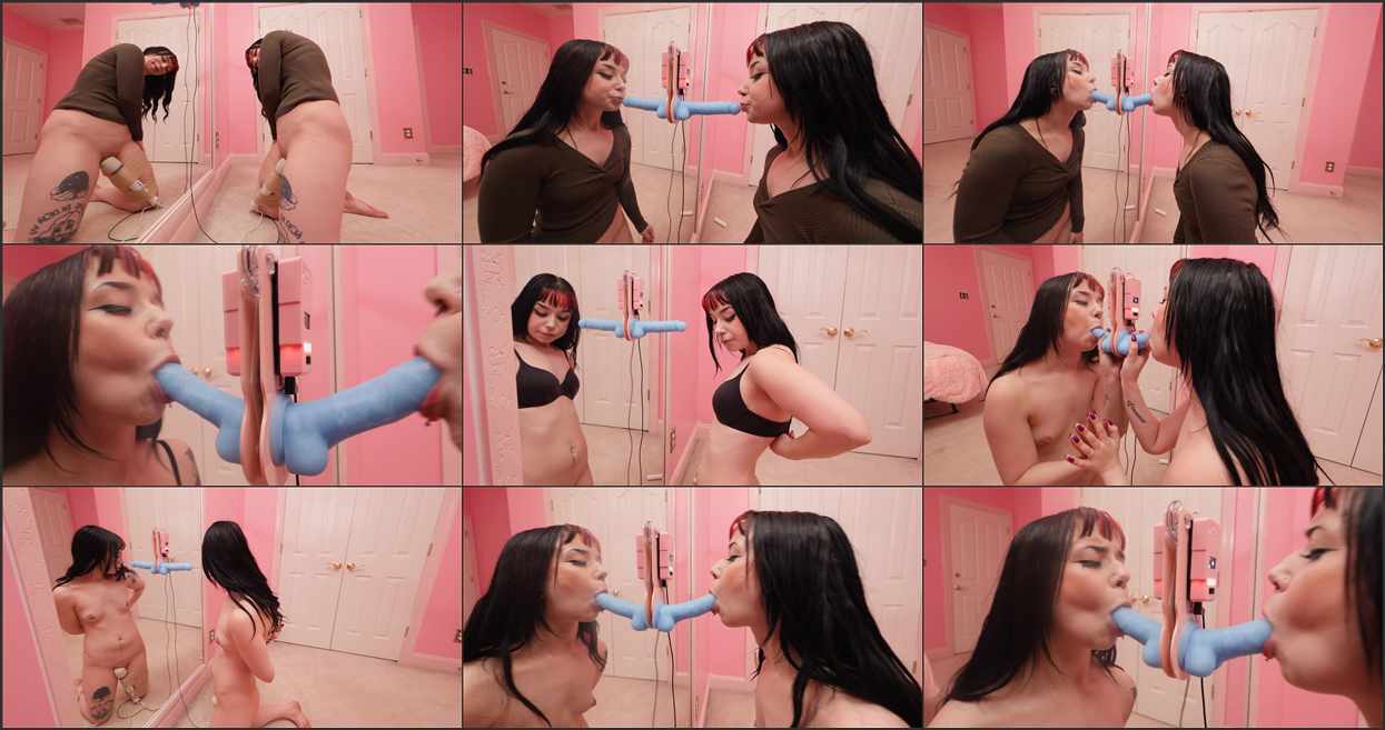 Ditria Rose gets deep throat training as a dildo is attached to a mirror with a device which turns the vibrator at her clit on higher the deeper she throats the dildo, giving a reward for her deep throating.