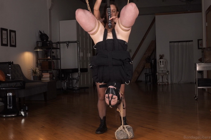 Elise Graves and Delphine Mason have been friends for a long time. They know one another pretty well at this point, which is why it is so easy for Elise to take full control of Delphine with very little effort. Elise knows what makes Delphine tick. She knows what causes discomfort in Delphine – and what entices her to push through that discomfort. On the surface, it looks very casual. Elise calmly guides her friend into a black straitjacket. She sweetly ties up each of Delphine’s legs in rope, and she carefully cranks the hoists that raise Delphine into the air. Once Delphine is suspended, Elise begins amping up the experience for her friend. She ties a heavy rock to Delphine’s neck for some additional sensation. She brings out the whip and the cane. She inserts a dick-on-a-stick in to the hairy pussy of her friend and ties it so there is no escaping it. Finally, after she feels that Delphine has earned it, Elise presses a vibrator to Delphine’s clit while fucking her with a dildo, resulting in three major orgasms! This is what friends are for, is it not?