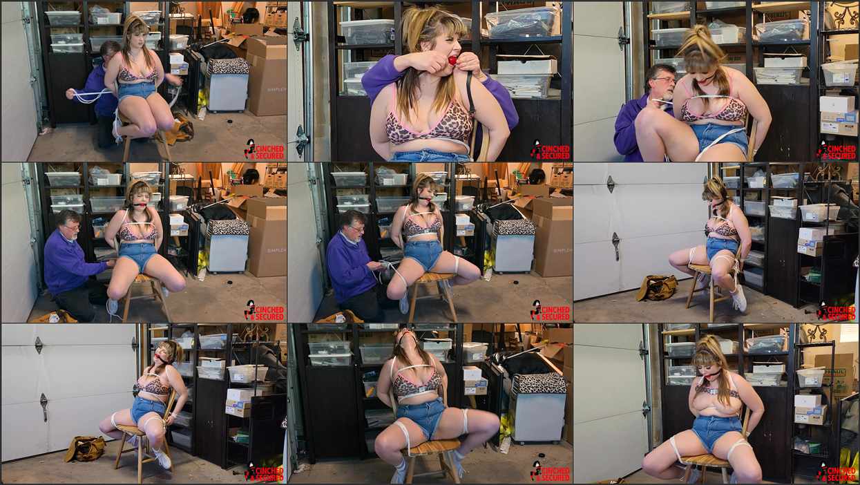 Poor Dolly! Captured in a cold, cluttered garage, she found herself being methodically tied to a chair in her jean shorts, sneakers and bikini top by a very determined burglar! If she had known how cold the garage was, she might have thrown on a jacket before venturing in, but she could never have known that she’d be stuck in the cold concrete space for the foreseeable future! Her legs were bound and spread far apart, her mouth stuffed with fat ball-gag and her struggles and groans were of no use! To add an extra level of helplessness, her huge tits were left exposed, and Dolly moaned as the cold air instantly stiffened her nipples! The drool running down her chin and chest didn’t help matters either! The bad news was that she would be shivering in bondage for some time, but the good news was that spring was only six weeks away!