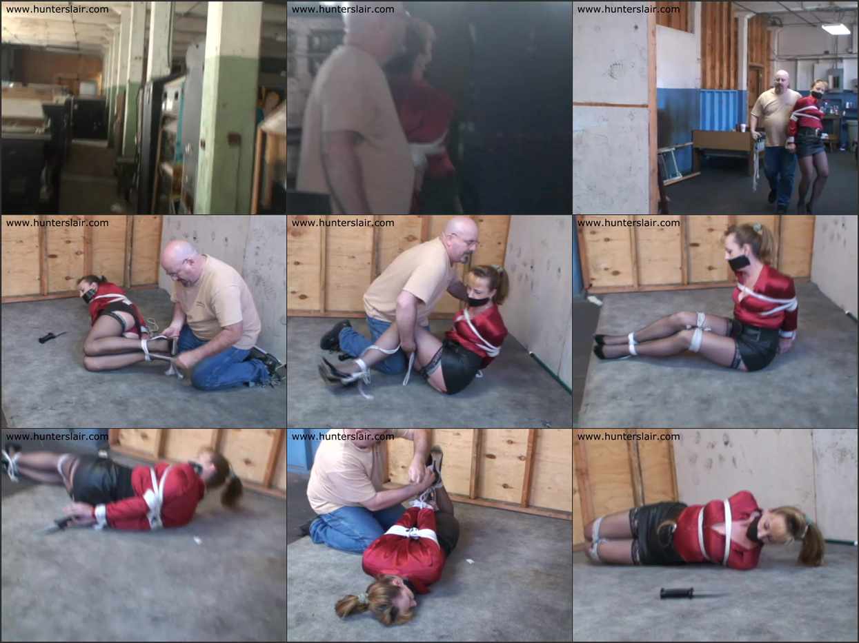 Sexy Dominique has escaped from the lair in a super short tight belted leather mini skirt, that exposes her stocking tops as she runs, and red silk blouse, in five inch heels. Her arms are still tied brutally tight behind her back and her mouth is packed and duct taped shut. But the Hunter is in hot pursuit as she runs lost in a warehouse maze of old machines. She hears him coming closer and darts between machines to frantically seach for an exit. But she realizes in her panic she has been running in circles. But at least she thinks she has lost him. But then to her terror he is there as she comes around a corner. He grabs her and drags her struggling back to the lair. Once there he pushes her to the floor and swiftly lashes her ankles and knees tightly together. But he needs more rope and leaves her there tightly bound on the floor. But she notices he has left his XXXX on the floor and she struggles over to it. She attempts to cut her bonds but he is back before she really gets to make any headway. He grabs the XXXX from her cold numb fingers and rolls her over onto her belly and hogties poor Dominique helpless on the floor. She is left helplessly hogtied with no chance of escape again.