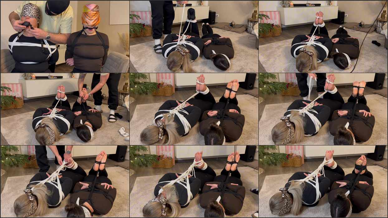 Charlie is visiting again. So, another hogtied session is in store. Our soles are tightly bound. Gagged with large ball gags. Later, he’ll tickle us and whip our soles with a whip.