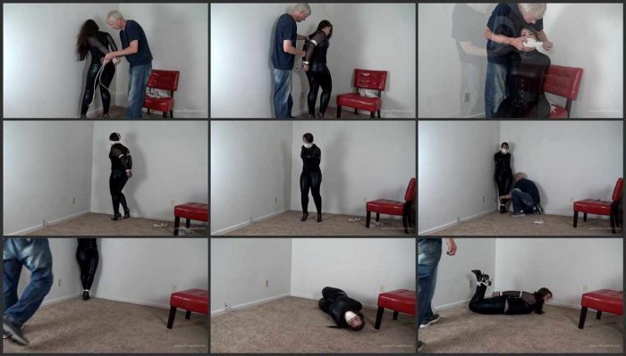 Elizabeth is awaiting her client planning out what she’s got in store when he finally shows up. He doesn’t really seem interested in the session they spoke of initially and starts moving around grabbing her rope and spinning her around. She’s hand gagged and her wrists and elbows bound before gagging her with mouth stuffing and microfoam tape. She’s tied for a bit with her neck leashed off to the ceiling before her “client returns, moving her to the floor and placing her in a hogtie. He returns one more time to deliver a final humiliation pulling her pants down and exposing her pantyhose clad ass for her next client to find.