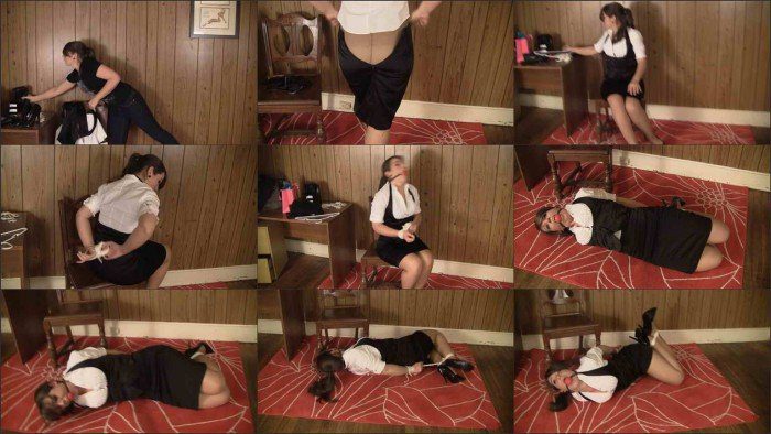 Elizabeth walks into the office after a long day of shopping. She decides that after dealing with holiday shopping traffic and stores full of people she’s going to treat herself to a bit of self bondage. She changes clothes out of her tight jeans and stiletto boots into her favorite shiny skirt and white blouse and shiny high heeled pumps. After topping the outfit off with her favorite shiny vest Elizabeth starts getting her gear ready for her self tie. Elizabeth starts with her ankles binding them tightly before grabbing a cinch she already premade for her hands. Slipping her wrists in with some difficulty she soon realizes that she forgot her gag. Fortunate that she hadn’t secured her wrist cinch yet she backtracks and ballgags herself. With all that done she finally secures her wrists behind her back…