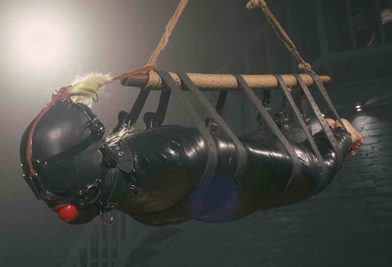 I lay Elli on the floor and secure her cocooned body parallel to a wooden pole attached to a hoist ring. After ensuring the setup and bindings are secure, I lift Elli off the ground, suspending her in the air and gently swinging the entire structure back and forth like a pendulum…
