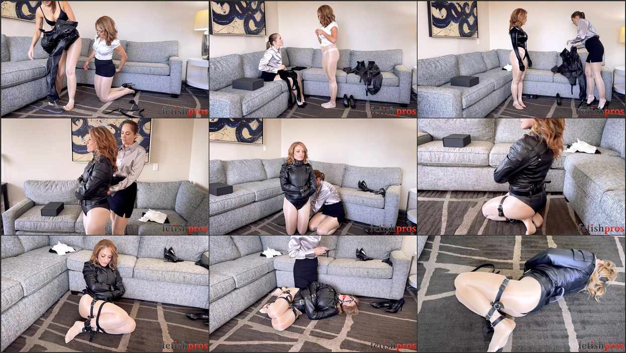 Alba Zevon arrives bubbly and eager for what she thinks is a sales position at bondage gear giant Stratus Restraints. The perky job-seeker perfectly plays the adaptable applicant, ready to embrace the company’s unique work culture—until she discovers HR rep Rachel Adams helplessly locked in a crinkly black leather straitjacket and ankle straps.