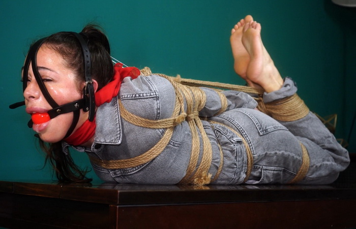 The clip captures the entire on-screen ties, performed by the rigger Rey. There are no cuts in this clip, all the ties are done on-screen. First, the elbows to challenge Fatima, then her upper body, the crotch rope and then the legs. The elbows are tied tightly, together and tucching the bust. Once her entire body is tied, Fatima is then put on the table tied in a tight hogtie, first the rope passes through the wrists, then the rope is passed around her necks for extra security. Once she’s tied so tightly, it’s time for the harness gag, a huge ball is placed in her mouth and a string is connected to keep the head arched is a restrained position… Fatima is excited to start… She become increasingly vulnerable, bound very tightly, elbows together, the hogtie pulled tight, and gagged and nose hooked…