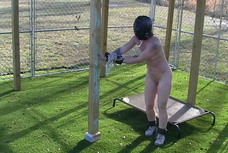 Its finally that time of day or week, as time is nothing but darkness beneath this sensory deprivation hood. The chains and shackles attached to my wrists and ankles and neck are a constant reminder that I am not in control. My trainer decides that its time for me to be caged in an outdoor setting so I can get some vitamin D from the sun altho its quite cold out, since I have been locked up in a chilly storage container for days, with no clothing except for the boots on the feet and the leather hood tightly laced over my head, eyes, ears and mouth.