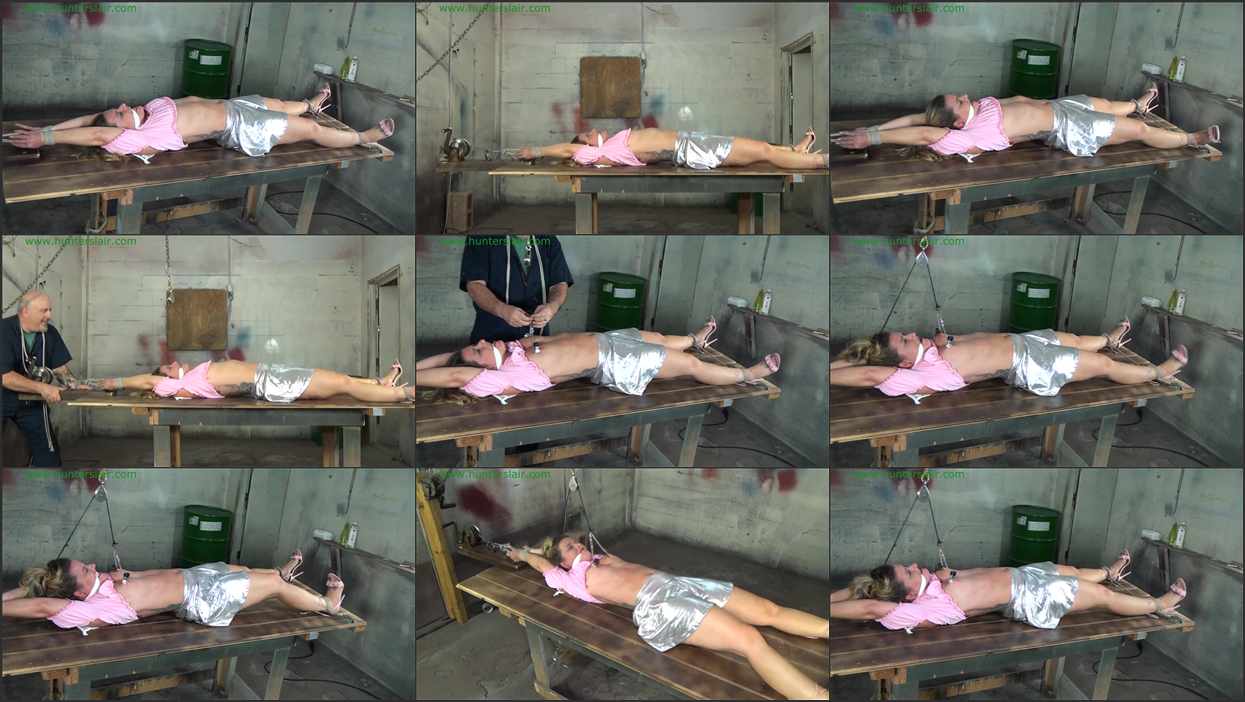 Once again the defiant Fayth finds herself tied to the Hunter’s table. It was bad enough that he had to humiliate her by making her wear pink. Her wrists are tied together over her head, attached to a chain and winch. Her legs are spread with her ankles tied to two ring mounted at the sides of the base of the table. The Hunter cranks the winch stretching Fayth out on the table until she can barely move. She curses and swears through the cleave gag tied between her lips. Fayth anxiously watches as the Hunter attaches a small pulley to the end of a chain hanging down from the ceiling just above her head. She struggles and pulls at the ropes in desperate attempt to free herself before he returns to complete is diabolical plan. But there is no escape, she can barely move her stretched out body at all. The Hunter returns and pulls her pretty pink crop top up to reveal her pierced nipples then as Fayth cries out in pain he attaches a set of steel nipple clamps to her nipples. She then watches in terror as he ties a short leather cord to the chain between the clamps and runs the leather cord up through the winch. He then grabs her by the hair and pulls her head up off the table and ties the other end of the leather cord to her pony tail. Fayth begs and pleads through her gag as he ties off the cord. He lets go of her head and leaves her alone to suffer. Fayth quickly realizes that she has to keep her head up or she will pull and stretch her poor sensitive, crushed nipples. She doesn’t know how long she can keep her head up before her neck muscles cramp and fatigue, any movement of her head pulls, twists and stretches her poor nipples. Fayth giggles, cries and swears at the hoplessness of her predicament. How long will the Hunter leave her to suffer in her cruel predicament?