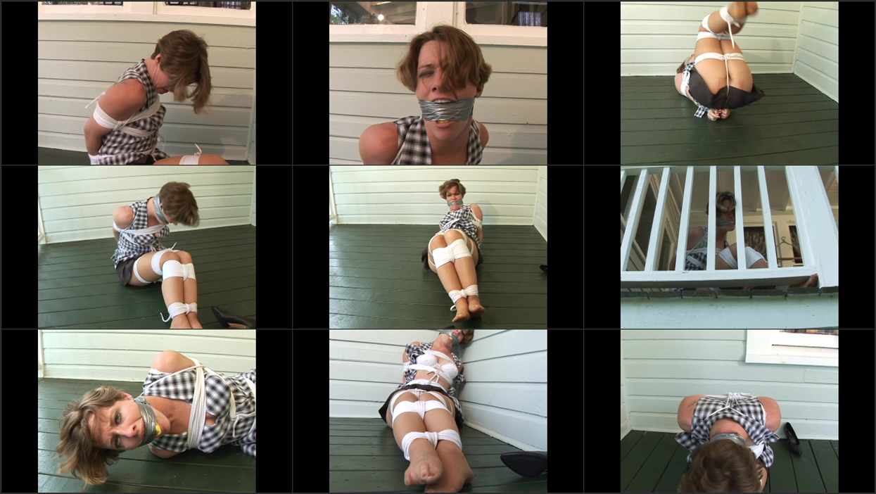 After they their way into Fayth’s house, one of them takes her out on her patio and ties her up to keep her out of the way. Then he stuff’s a kitchen sponge in her mouth to shut her up. To make sure the sponge stays put, he VERY tightly wraps duct tape around her face and mouth. Fayth is then left tightly tied with lots of rope and tightly gagged as the men rob her. She tries her best to get the attention of passing cars from her patio. But with the sponge being almost into her throat, she gags on it every time she opens her mouth.