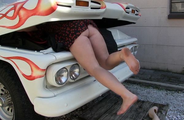 I wanted to do something special for my sweetheart for Valentines Day and he said I could get out of the booty call If i changed out the spark plug in his truck. I definitely am not dressed for the occasion but heck, how bad could it be. Should be easy as pie, right? I grab what tools i think I need and pull up this wooden step thing and use a moving blanket to cover the paint as he did insist i don’t scratch this awesome flame paint job up on this antique truck. I bend over the radiator and battery and start my mission. Hell if i know where the spark plug thingy majiggy is. Its so greasy and gross under here. You watch as I kick my legs and my high heels in the air as I cant find the plug spot. My dress is short and I don’t wear panties so this is definitely to your advantage. I crawl a bit more into the hood but as I do that the hood falls down on my lower back. I can’t see and I cant get out nor can I move. I am stuck but i still do try to look for this thingy under the hood. My hair gets caught on things, i made ridiculous comments, and I move my hips and legs like i’ve never moved them. My belly hurts from all my weight being on this very uncomfortable truck ledge. I kick my high heels off thinking this will help me get unstuck but it definitely does not. Finally the boys come back from having some beers and have a spank on my ass in my vulnerable position. They do not raise the hood up and off of me. They humiliate me as I really just wanted to help but I guess I should have learned what a spark plug and ratchet looked like first before crawling under the hood. The guys leave me hear letting me know if I need anything to just holar. Damn it man. I’m stuck…and they don’t care as they go off to have more beer instead of helping me out as I just kick and flail my legs in the air.