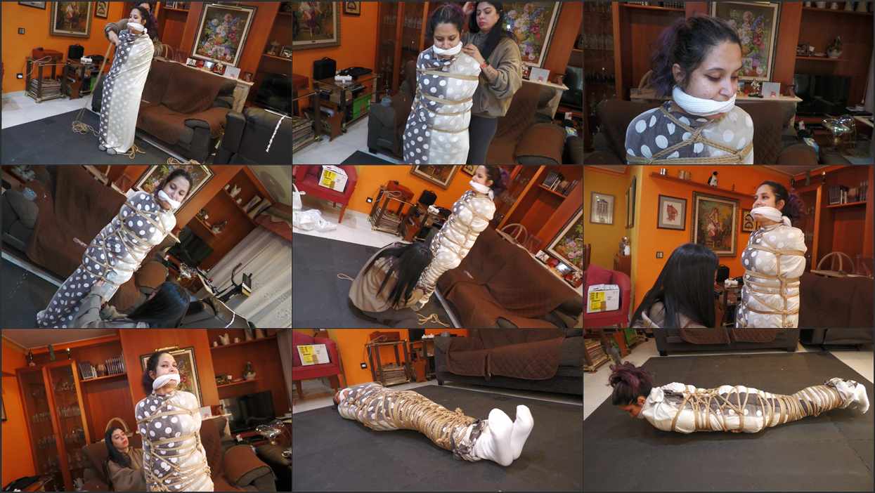 Liricaa has been a burglar for so many years, but she always finds new ways to keep her victims tied up. Her new target is Fernanda. She’s in the couch while Liricaa sneaks from behind and grabs her. She ties each of her hands individually to her torso with tape. Then she gags her with a huge long sock! After that, Liricaa covers Fernanda in a sheet, and then ties her up with a massive around of rope. Absolutely impossible for Fernanda to go anywhere! Liricaa leaves for the loot and Fernanda is left there, tied up and gagged. She struggles trying to escape, but is completely impossible. Is gonna be there mummified with the sheet and tied up with a massive amount of ropes for a long time “MMMMMMMMMMMPPPPPPPPPPPPHHHHHHHHHH!!!!!!!!!”…
