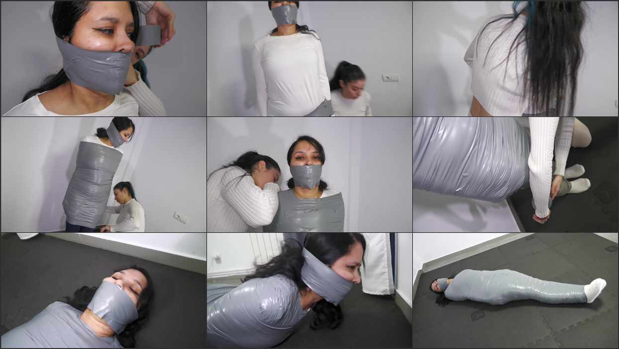 Fernanda has a safe box where she keeps all her money and important documents. She’s the perfect target for Liricaa! Liricaa sneaks from behind and grabs her. “What the… MMMMMMMMMPPPPPPPPPPHHHHHHHH!!!!!!!!”. Liricaa handgags her. She ties each of her hands individually to her torso with tape. Then she gags her with socks and a big tapegag. “MMMMMMMMMMMPPPPPPPPPPPPPPPHHHHHHHHH!!!!!!!!”. Fernanda is so angry and frustrated! Liricaa mummifies her with tape, is totally impossible that Fernanda can go anywhere. Now Liricaa is free to go for the safe box, while Fernanda is left there, mummified. She’s totally helpless! “MMMMMMMMMMPPPPPPPPPPPPPPPHHHHHHHH!!!!!!!!!”.