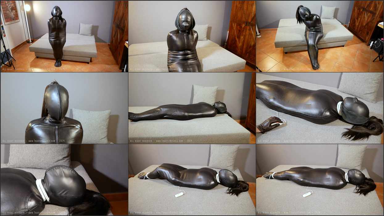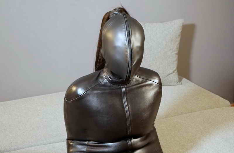 The perfect Bondage recipe. A naked girl inside a tight leather bag. A leather case, from which it is impossible to escape. A sealed mouth and the head tightened in a double-breasted hood. A game of sensory deprivation and breathing. Finally a vibrator that slowly makes you reach orgasm.