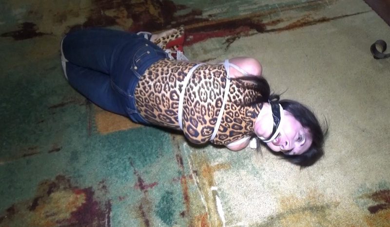 The Hunter drags his hot bitchy wife Gigi into the living room by her hair, Gigi’s are are strictly bound behind her back with her elbows crushed together, her wrists tightly bound and ropes cicling her chest, shoulders and arms, pinning her arms to her back. She curses and bitches at him so he pulls out a long strip of torn sheet and pulls it between her teeth, the long sheet is then wrapped around and around her head, pulling the corners of her mouth back and stifling her bitching and complaining. Gigi is pushed onto the sofa where he wraps ropes around her flailing legs and ankles, fusing her legs tightly together. But Gigi’s screams, bitching and complaining can still be heard through her tight cleave gag so the Hunter pulls out a roll of shiny black electrical tape and pulls it between her teeth, over the tight cleave gag and wraps it around and around her head. The stretchy black tape pulls the gag deep within her jaws stifling her screams. Gigi is rolled to the floor and tightly hogtied then to her XXXX he pulls her up onto her knee points. Gigi screams begs and cries through her gag as the Hunter taunts, teases and terrifies her by balancing her on her knee points in the cruel hogtie. The Hunter makes his point with his hot defiant wife and rolls her back onto the floor and grabs more rope. He pulls the rope between her gagged lips and ties it around her head then pulls her head back with the rope and ties it off to her bound ankles. Gigi’s can not more her head now of really any part of her tightly bound body. She can barely roll over as the Hunter leaves her alone to contemplate her attitude.