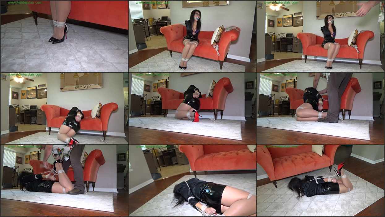 Sexy MILF Gigi sits on her sofa strictly bound and gagged. Ropes crush her elbows together behind her back her forearms fused together and her wrists tied. Gigi’s curvy legs are fused together with ropes cinched around her ankles and knees. A pair of panties have been stuffed into her mouth with an old torn sheet pulled between her lips to keep the panties packed in tight. Her soft satin blouse is pulled open and a skin tight shiny skirt is stretched over her ample ass. The Hunter comes in to tease and torment her before adding more ropes. Ropes are tied around her chest, shoulders and arms then he pulls her bound stiletto heels up to her hands and runs the rope down from her shoulders to between her bound heels. Gigi’s limber body is jerked into a strict hogtie on the floor where he leaves her to struggle helplessly in the ropes.