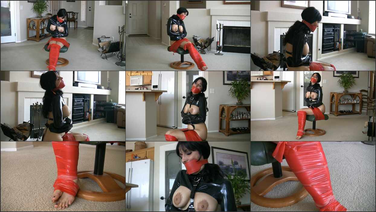 It was not long after they became intimate that Hannah’s new boyfriend introduced her to bondage games. She found the kinky foreplay extremely erotic. In this scene Hannah tries out his latex bolero straitjacket and Thera-Band wrap for the first time. She is seat-belted to a footstool with her legs welded together by the rubber wrapping for now, but given he left her naked except for the rubber bondage toys, she expects to be moved later so he can play with her privates. For now, she must sit there with a leather panel gag strapped tight over her mouth and suck on the big plug inside. She does not mind. Sensually squirming and trying to escape whatever bondage he puts her in came as a naturally pleasurable activity since the beginning. Giving him bedroom eyes and making little ‘rescue me’ moans behind her gag keeps her boyfriend tumescent and his loving gaze upon her unwavering, which turns her on even more.