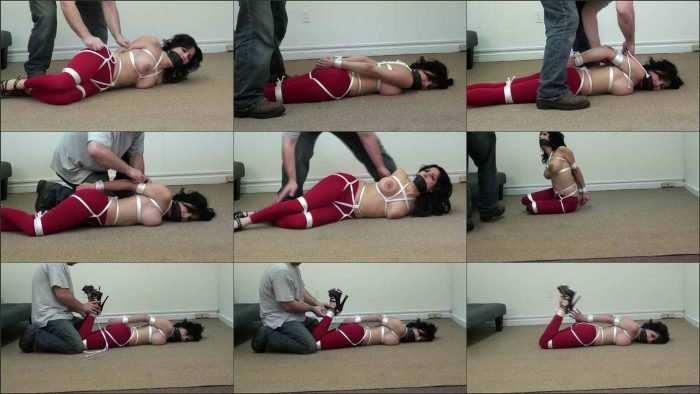 Hannah Perez sexily roped up in skintight red tights and super sexy platform high heeled strappy sandals! Hannah is topless and she really shows off her fantastic figure! Hannah’s cute mouth is silenced with my classic black leather strap gag…Hannah wears it so well! This series showcases a beautiful young lady tied up and struggling…what better way is there for a sexy brunette to spend an afternoon??