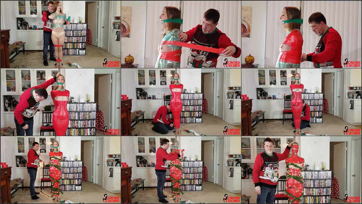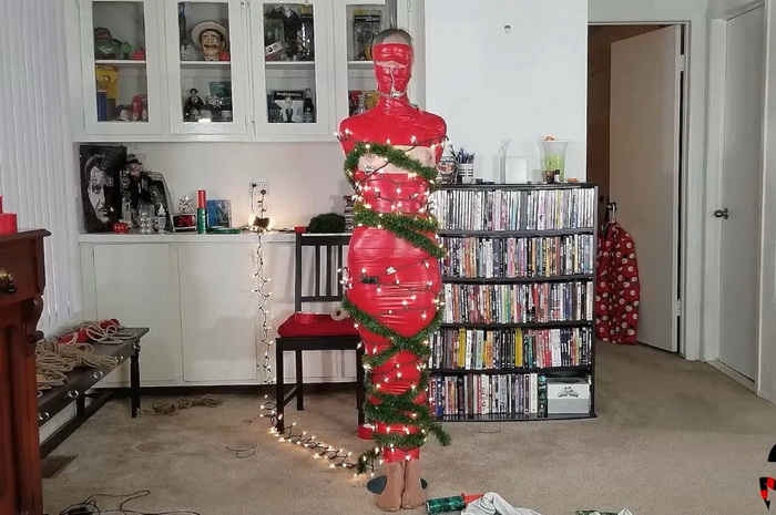 Rogue was adamant that we not have a Christmas tree this year. She hates the mess, she dislikes the cost, and she finds cutting down a tree to be offensive environmentally. However, we do need something to put the presents under, so she’ll have to become the substitute! Stripped to her panties and bound to a pole, she has a pair of old socks stuffed and taped into her mouth, so her cries for help won’t disturb the carolers outside! I wrap her entire body in plastic, leaving only her feet, face and beautiful perky breasts free, and then I cover the poor girl with bright red festive tape! Now unable to move at all, she cannot stop me from binding her further with a string of festive holiday lights and garland! Something still seems to be missing, though….ornaments! A pair of Christmas bulbs hung from each nipple make her truly a wonderful sight, and her gagged mouth ensures a silent night! In fact, she looks so beautiful, I decide she’ll be the perfect image for our Christmas cards this year! However, I know she doesn’t want to be identified all bound and gagged like this, so I come up with a solution! I wrap her face in plastic and tape, hiding her identity and further silencing the protesting girl! Since she cannot move or speak, this also seems like the perfect time to tell her that my mother will be spending the holidays with us! With that news ringing in her ears, I turn out the lights to enjoy some eggnog as my new tree whimpers the night away!