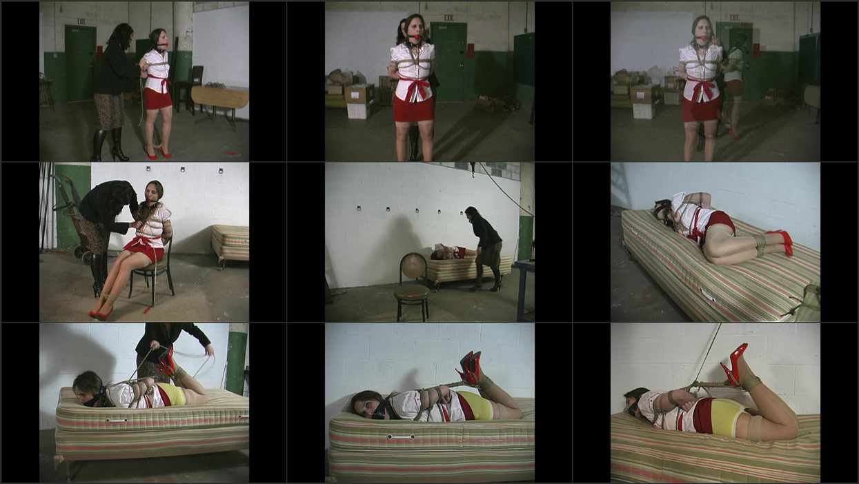 When the video begins I gag Ivy Cat with a big red ballgag and then tie her up on screen (about 7 minutes of tieing) next I leash her and lead her across the warehouse floor and sit her in a chair, where I pull her boobs out of her pretty blouse, retie her ankles and gag her with a shop rag and lots of black electrical tape. I have her hop over to the old bed, she lays down and struggles for a bit and we get to see her gold open bottomed girdle and seamed stockings before I put her into a tight hogtie and spank her a bit before I leave her to struggle some more, but I’m not finished yet…