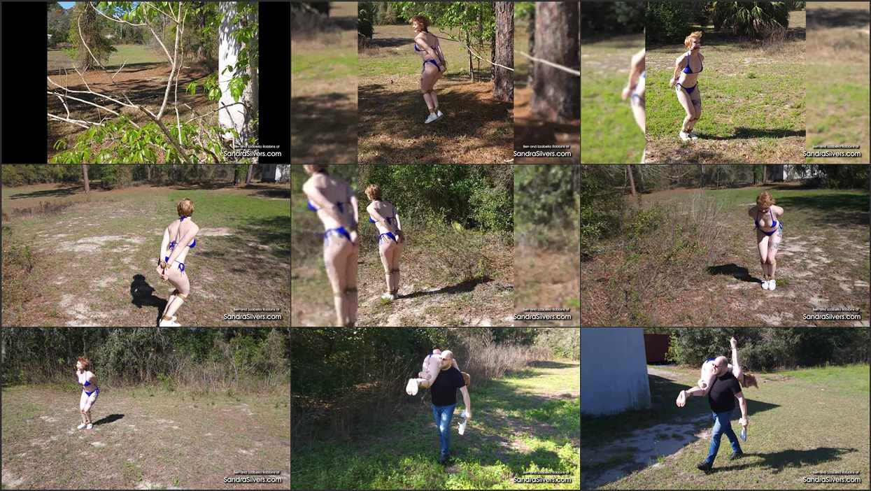 From whence she came we don’t quite know, but here she hops into view, checking this way and that, as a visage of bountiful bound beauty in a blue bikini bops her way out into the wilds of woods and grassy clearings. As this bikini bird bounces, hopping hopefully in her chance of escape, Izzabella Robbins makes a good bit of ground in her sneakered feet and micro 2-piece swimwear, ass cheeks and boobs bouncing as she gathers speed. Yet a dark shirted form looms beneath the trees, his boots make up the distance between himself and the bound bird in a beat, catching her up with a huge hand over her mouth, lifting and carrying the lass over his shoulder across a field, taking off her running shoes with one hand to reveal her baresoles kicking at the air, and takes the red-headed woman into his warehouse; The Mettleworks…