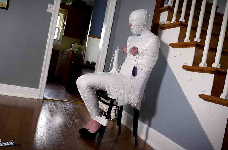 He moves quickly, layering strip after strip of tape over the clear wrap until only her head remains uncovered. He removes the tape from her lips, but it is only a brief respite before having panties callously stuffed into her mouth. With wide eyes of disbelief she can do nothing as he wraps her face tightly with clear tape. Finally, he encases her head with both wrap and tape until only her nose is exposed. As a further indignity, he jams a magic wand between her legs and against her pussy, turning it on and leaving her to suffer…