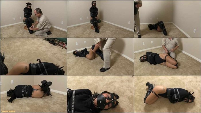 Her birthday arrived and I had not picked up a gift. I wondered at the last moment if she would like bondage for her birthday, as I am always prepared for that kind of giving. She accepted, but upon arrival was not aware her birthday cake was still in progress, and she would have to endure a no escape bondage and punishing gag ordeal, with no attention paid to her, while the oven did its thing. When Jacky learned of my plan, she went immediately into damsel mode. Fortunately, I already had her ensconced in the embellished with leather straps, cuffs, and finger control mitts, leotard-style spandex straitjacket, and strictly gagged with a head harness panel plug gag. Helpless Jacky is lead into the currently blank playroom, gag-talk complaining about what she recently learned was in store for her. While busy in the kitchen, I left the door open to her temporary prison so I could relish her muffled lady voice, and hear her safe grunts, which of course she never uttered. However, while doing a visual check, I decided she might be able to worm out of the room, so I added a strap that folded her legs into hogtie. Are we having a nice birthday, bondage girl? Booted legs strapped on screen.