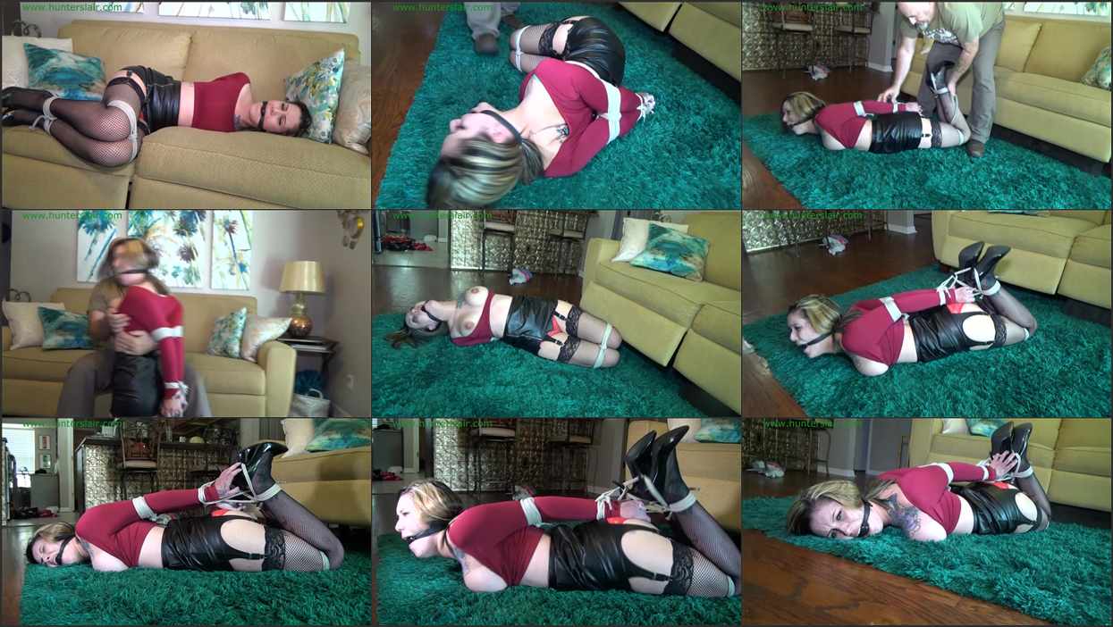 Busty Jae Lynn is hopped into the living room tightly bound and gagged. Her big tits flop under her skin tight crop top with each hop. Her elbows are brutally crushed together behind her back with her wrists tied and her forearms fused together. Her curvy legs are welded together with ropes around her ankles and knees with a big black ballgag jammed between her teeth to keep her quiet. The Hunter grabs and gropes her as she struggles to keep her balance on her bound stiletto heels. She is pushed onto the sofa and left to struggle as he goes to get more rope. Jae Lynn struggles off the sofa and onto the floor to try to crawl away and hide. But she quickly realizes that crawling with her elbows crushed together behind her back and her legs tightly bound is no so easy. The Hunter comes back in with more rope and pulls her over to the sofa and pulls her big tits out of her tight crop top. He grabs and gropes her tits before rolling her back over onto her belly and ties a rope between her bound stiletto heels. The rope is run up between her bound wrists and her legs are pulled up into a strict hogtie. With her stiletto heels touching her hands Jae Lynn has never felt so helpless and vunerable. The Hunter pulls her up onto her knee points and as he continues to grab and grope her helplessly bound body Jae Lynn struggles to keep her balance. The Hunter finally rolls her over onto belly and leaves her struggling helplessly on the carpet. Jae Lynn can barely move or even roll over in the brutally tight hogtie as she sobs and cries into her gag wondering how long the Hunter can keep her so strictly bound and gagged.