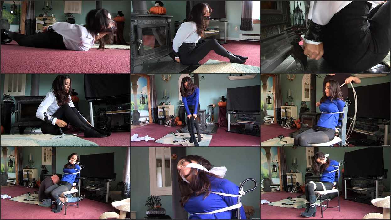 Jamie feels that she has been working very hard at Dave’s firm doing a lot of overtime, so she decides to ask for a raise. Dave refuses, pointing out that she would not have to do so much overtime if she was not so slow at her job. Jamie is outraged, and in the heat of the moment tells Dave that maybe he should not have let her handle his personal accounts because she now knows about his dirty little secrets. Dave leaves the room leaving Jamie quietly fuming. She believes he has gone to get his checkbook to bribe her to keep quiet, but instead he returns and ties her up with duct tape, securing her wrists and ankles before he attempts to gag her. Jamie tries to fight him off but there is nothing she can do to stop him applying several strips of very sticky duct tape over her mouth. After Dave leaves the room, wondering what he is going to do about this troublesome secretary, Jamie works her way over to the iron wood stove and begins sawing at the tape binding her wrists on the corner of one of the stove’s legs. She works furiously, aware that she must escape before Dave decides to take more drastic action. Just when she thinks the tape will never part, it finally does! She ungags herself and unwraps the tape binding her ankles, then makes a run for her car. Alas, Dave is already there, planning to move her vehicle somewhere more discrete. He takes Jamie back to the house, makes her remove her blouse and put on a sexy sweater and a pair of boots, then ties her to a chair and cleave gags her. Once again, Jamie does her best to escape, but the ropes are tight and she cant reach anything that might help her.