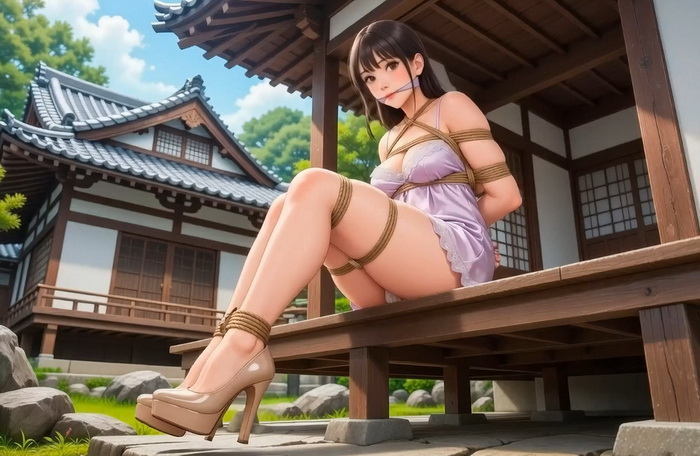 She waits patiently in the peaceful temple courtyard, the soft breeze teasing her exposed thighs, her body arched in elegant restraint. When he finally arrives, the sight of his gorgeous wife expertly tied and presented like a living work of art ignites his desire. He approaches slowly, savoring every detail then gently but firmly stuffs a soft cloth into her waiting mouth and ties a tight cleave gag with purple silk, muffling her excited moans as he claims his surprise…
