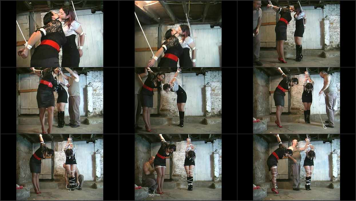 The Hunter has Kali & JJ bound up in his cellar. Their arms tied off to the ceiling and their mouths connected by a two strap ballgag. The women balance in their heels with their mouths intertwined and they just can’t get much relief. After just a few minutes the Hunter decides to pull JJ’s arms up higher and to take the gag out of Kali’s mouth. He shoves a pair of panties in her mouth and wraps her head tightly with tape and then pulls her arms up into a painful strappado. He does the same thing to JJ and wraps rope securely around the girls legs and leaves them there to struggle with their shoulders stretched to the max.