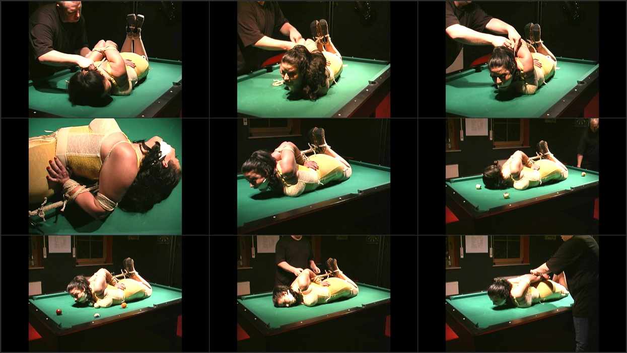 Let me apologize for the realllllllly harsh light in this clip!! It starts when my arms and legs have already been tied up. He puts me in a pretty brutal chicken wing. Then he hogties me, attaching the hogtie rope to the rope at my shoulders pulling it nice and snug. This is the kind of hogtie that I can’t really get any relief by rolling over in. He stuffs my mouth with a HUGE red foam ball and wraps microfoam tape tightly around my head. He does snap some photos at this point….as I try to move, lol. Then he rolls me to the side, since I can’t seem to do it for myself. I am totally helpless. I do manage to get back to my stomach, yelping very loud….then I roll halfway to the other side getting stuck. He comes back and shoves me over. He then takes some drumsticks and plays drums on my girdled butt, then he can’t help but put roll me around on the pool table after he snaps some more pics. Boy do I look distressed…. I see him walk by with the poolstick and then balls going past my head. He decides to play pool with me in the center of the table…He aims for all of my girlie parts of course. This goes on for a while and I try to gather the balls under my chest so he has less to aim at me. He does eventually let me out and I ungag myself with my arms working about half way.