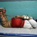 Tony brings his date into his living room after driving her home with her wrists tied after a night drinking. They have a conversation about her sore feet. He promises to give her a good foot rub, he just wants to add rope first. Her heels come off and he adds rope and a ballgag. He has her get to the floor and he hogties her, changes her gag to an open mouth gag, ties up her toes, touches her feet for about 5 seconds, watches her struggle, adds a blindfold, watches her struggle more and then drops his pants as she protests.