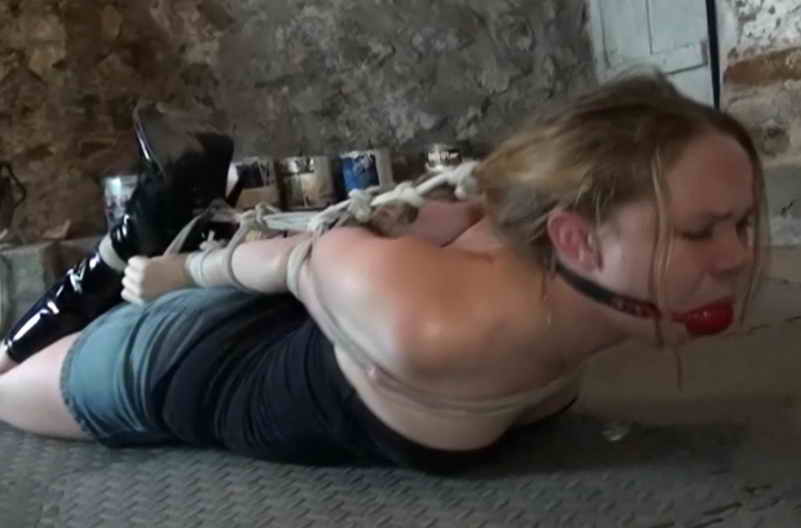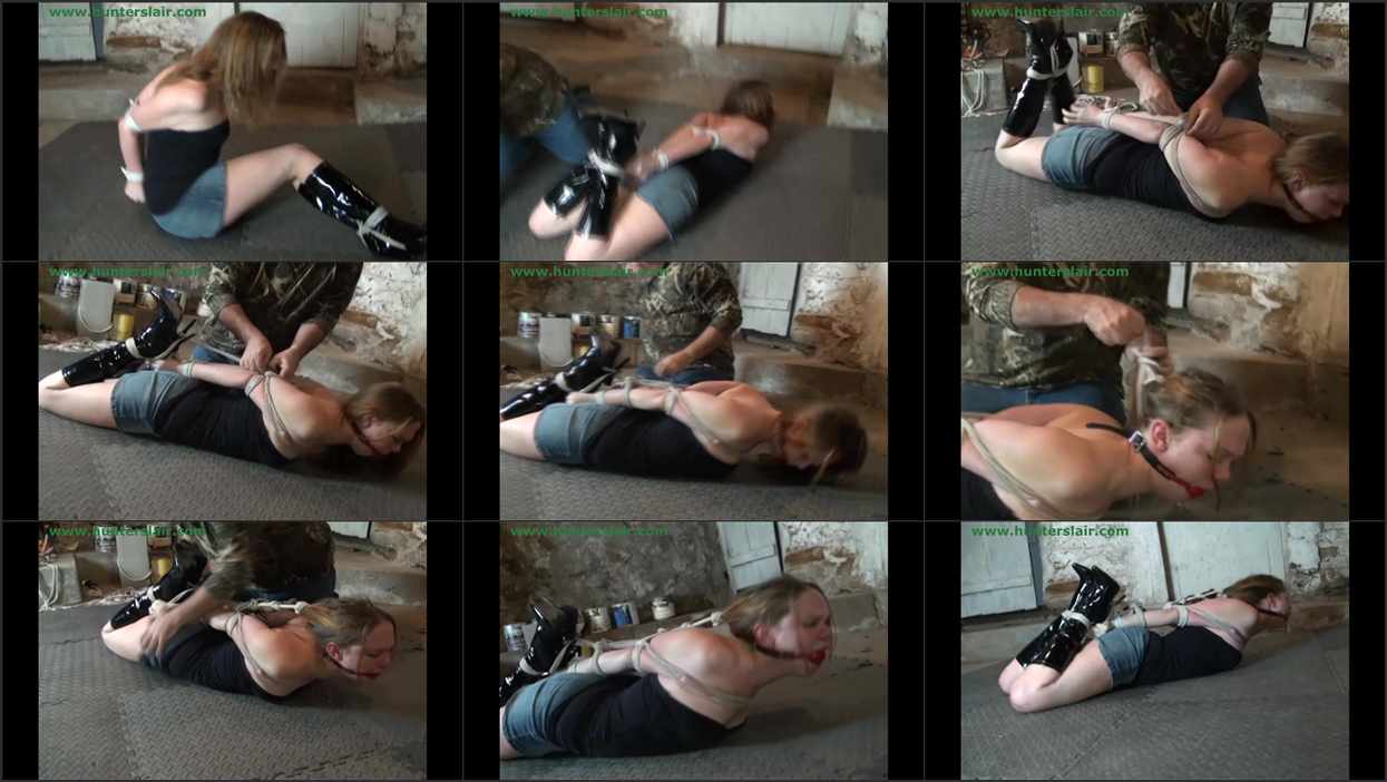 The Hunter’s new leggy, red head, neighbor Julia, was curious as to what went on at his house with pretty girls coming and going through out the week. She had never experienced real bondage before and thought it would be fun. So she now sits in his basement with her arms fused tightly together behind her back with ropes. Her booted ankles are tightly tied and a large red ball gag has been tightly strapped into her mouth. She struggles on the floor helplessly, she thinks she has changed her mind and wants to be released. She reaches for her bound ankles with her nibble fingers trying to find the knots. But the Hunter will have none of that, he comes in and after checking out her firm ripe ass he wraps a rope around her chest, shoulders and arms and then flips her onto her belly. Julia complains into her gag as he attaches her bound ankles up near her wrists to the chest rope. After pulling the hogtie ropes bowstring tight he then starts to weave a rope into her long red hair. He then pulls her head back and attaches the rope to her arm bondage. He tells her he will return in the morning to let her go and to have a good night. Julia snorts in disbelief as he departs leaving her brutally hogtied and helpless on the floor.