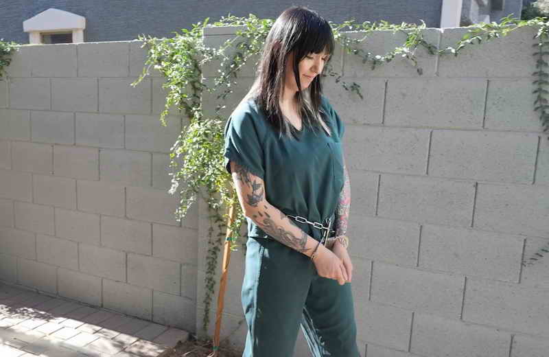Inmate Luna Lux is in prison, serving her sentence. She is in a green jumpsuit, with her hands cuffed in front with a pair of chained shackles. Officer Kaitlynn shows up to let Luna Lux out of her cell. She removes her handcuffs and tells her to face the wall and replaces her cuffs with a waist chain with her hands cuffed in front and a pair of shackles. Officer Kaitlynn escorts Luna Lux outside for some fresh air and sun. She makes Luna pace around the yard to get some exercise and stretch her legs. When it gets too hot out Kaitlynn hands Luna some water and then brings her back inside.