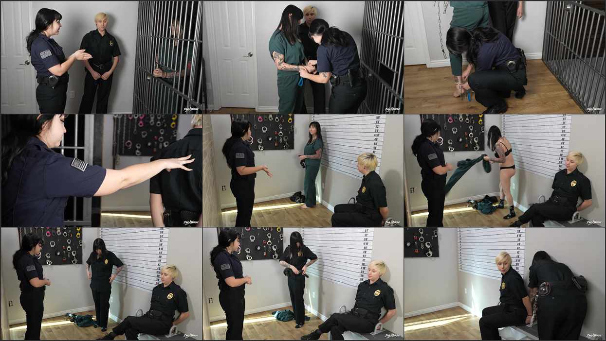 Kaitlynn Day is locking Luna Lux back in her cell and about to walk away when Officer Celene Thorne walks into frame and tells Luna she has good news. She also tells Kaitlynn that she needs to stay for the news. Officer Celene tells Luna that she’s being let out because it’s been discovered that she was framed by none other than Officer Kaitlynn Day herself. Luna Lux is let out of her cell and her cuffs and shackles are removed and she is allowed to go find her uniform. Kaitlynn is placed under arrest by Officer Celene and is quickly handcuffed with her hands behind her back, and then cuffed to a bench. Officer Luna puts her uniform back on, including her badge and belt before removing Kaitlynn from the bench and and getting ready to search her.