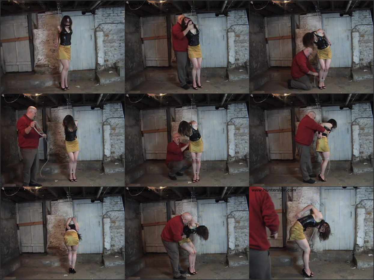 Sexy Kali is standing in the Hunter’s basement with her elbows strictly bound behind her back. A rope is tied to her elbows up to an overhead beam lifing her elbows up behind her. A rag has been stuffed into her mouth and black electrical tape is wrapped around her head between her teeth holding the rag deep in her mouth. Kali struggles helplessly kicking and pulling at the ropes but there is no hope of escape. The Hunter comes in with more ropes and ties her ankles and knees tightly together. A rope is tied around the back of her neck and down to her knees pulling her doubled over with her tight spandex skirt riding up her ass cheeks. He then ties her wrists together before leaving her hanging helplessly in the icy cold basement.