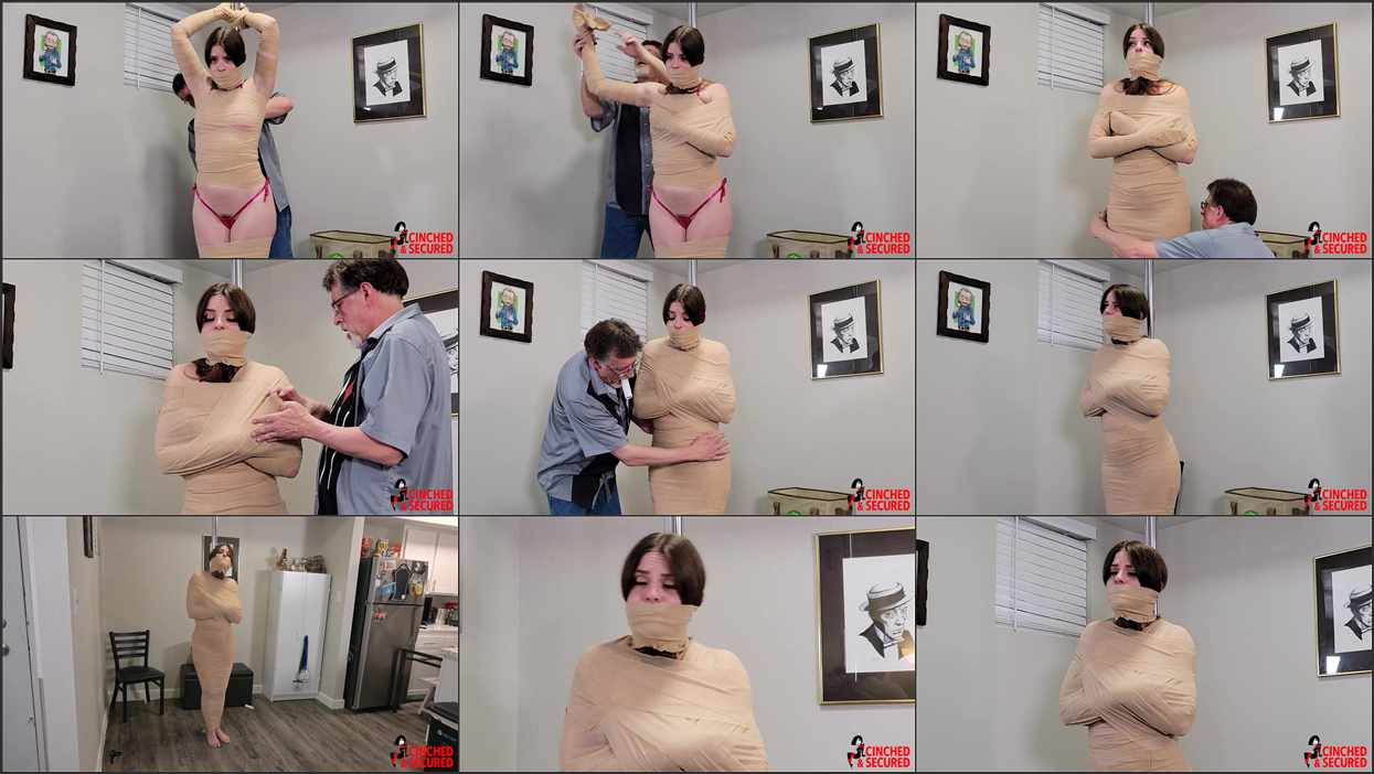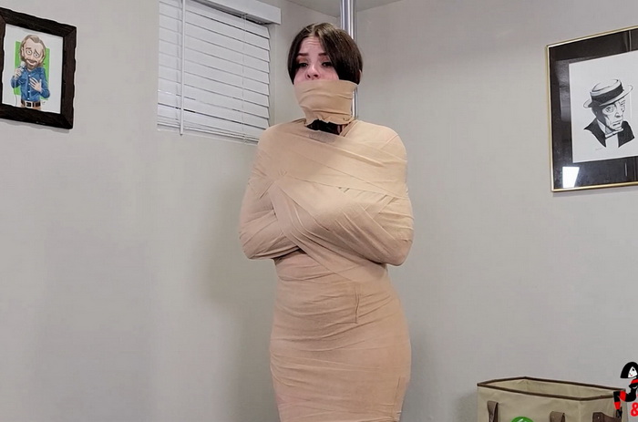 Poor Kat! She had been enjoying a pleasant day at the beach when she was grabbed by a crazed Egyptian scholar who was struck by her resemblance to an ancient Egyptian goddess! Worse still, legend stated that this goddess would return from the beyond to bring about the end of the world! Determined not to allow that to happen, the scholar took her to his home in order to perform a purification ritual on her! Tied to a pole with her arms anchored above her, her mouth filled and wrapped shut to prevent her from screaming, the scholar began to cover her entire body in bandages! He released her hands only to fold them over her chest and secure them with even more bondage as she squirmed helplessly. She could do nothing but watch, wide-eyed, as her body slowly vanished beneath the ever tightening cocoon! Soon, she was a tightly packed helpless thing, encased in unforgiving bondage and left to wriggle and mewl. She would be left this way for a full week, all while awaiting the next step in the ritual!