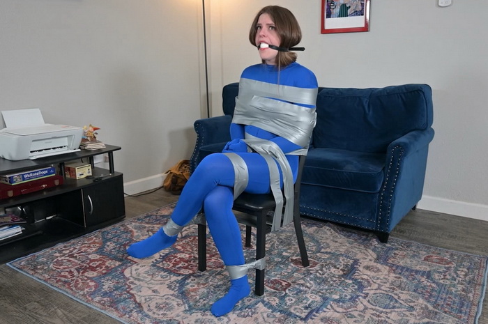 Poor Kat! She was caught and taped to a chair by a strange burglar with a fetish for body suits! After dressing her in a bright blue suit, he taped her up and stuffed a ball gag in her mouth and left her to struggle! Sadly, he soon decided she needed more tape, and before she knew it, her torso was absolutely welded to the frame of the chair! The good news? He seemed satisfied with his handiwork and left her bound and gagged and struggling. The bad news? He planned to return later!