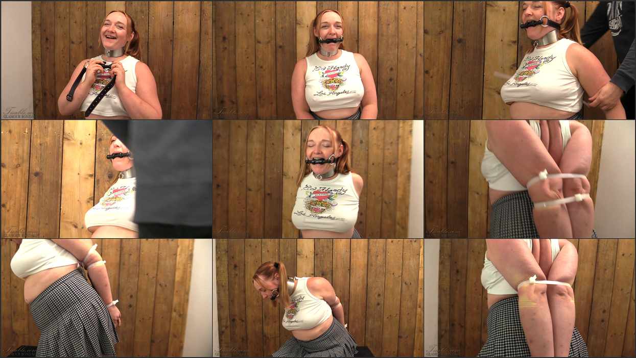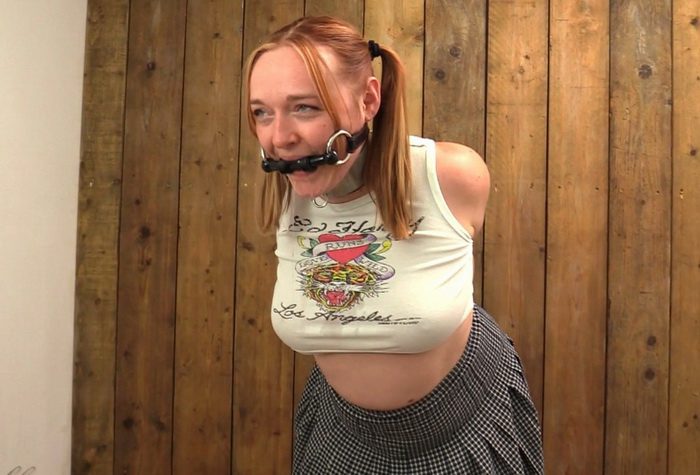 Kerry is back! Can she still do elbow bondage? Of course she can!! I ziptied her elbows together, it was extremely tight! Kerry loves tight bondage, so don’t worry! The gag was a bigger challenge! It is a tongue port gag. With a tongue suppressor very far into Kerry’s mouth, it takes skill and concentration to keep a gag reflex down. It also makes Kerry drool uncontrollably, rivers of drool!! Nothing she can do about that with her arms pinned behind her back!