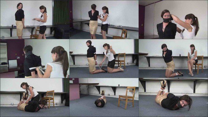 Kitty reports to Elizabeth’s office for some reprimands. She’s apparently been up to gossiping again about her co workers. Elizabeth can’t have this and she intends to punish her strongly for her misdeeds. She turns her around and puts her arms behind her back taking a length of rope and wrapping her wrists and binding them behind her back. Next she’s gagged with a large purple cloth and its held in with black vet wrap wrapped tightly around her head. Turning her around after the gag her elbows are tightly bound together next. Elizabeth then takes Kitty down to her knees and tightly binds her high heeled ankles together. She makes her crawl around a bit before taking her down to her belly and adding a new rope tightly hogtying her. Elizabeth doesn’t leave any slack in the hogtie and laces it off. She tells Kitty to struggle for her and Kitty does her best to please Ms Andrews.