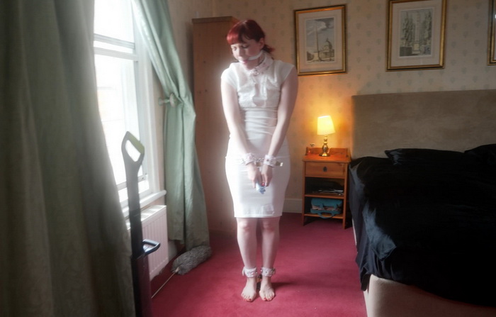Kitty’s Master has chosen pretty new cuffs for her to wear today, white leather decorated with pink lace and roses. Of course they have to be functional as well as decorative, so they are padlocked with a short length of chain between her ankles and wrists together, and the collar is nice and tight. Add a matching pink ballgag and she is ready to perform her daily maid duties in the bedroom. Tidying, vaccuuming, dusting, cleaning – all while giving her Master’s house guests a really tantalising tease show. And as ordered at the end she sits and awaits his pleasure.