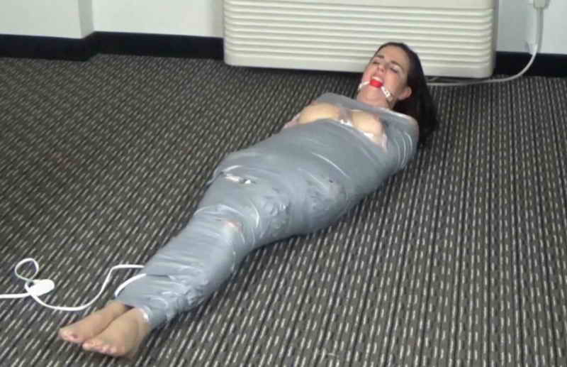 As I continue to place Kobe in tight mummification, her sexy pantyhose covered body slowly disappears into a tight, silvery cocoon. Once I have Kobe completely wrapped in tight mummification i place a black ball gag tightly in her mouth. Her big, sexy tits remain exposed to enjoy their beauty. Now it’s time for some fun…
